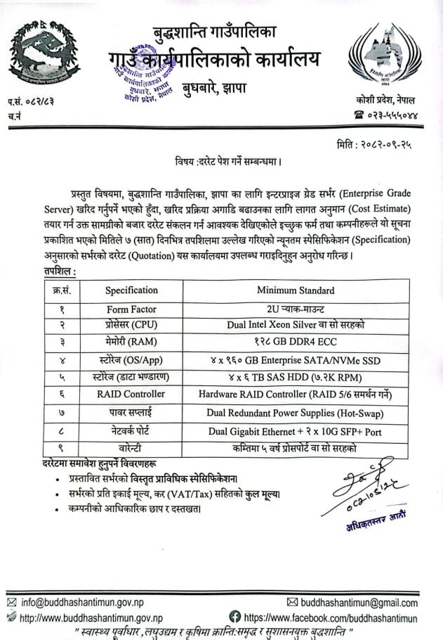 दर रेट पेश गर्ने सम्बन्धमा । (Enterprise Grade Server)